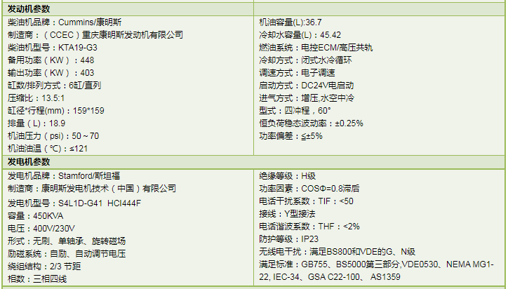 400kw康明斯發電機的參數